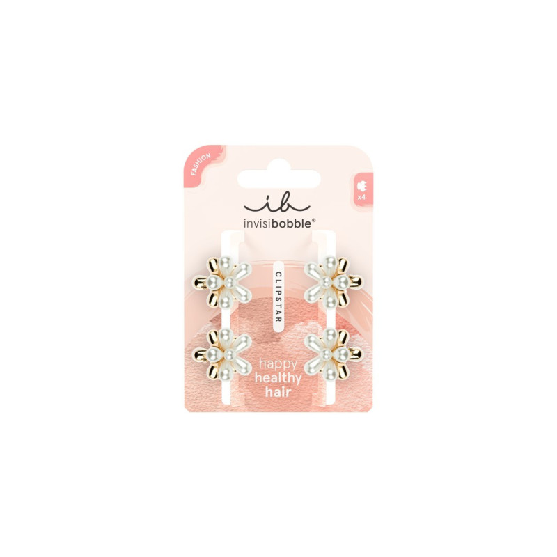 Jemné květinové skřipce s perleťovým efektem pro romantický a hravý účes.