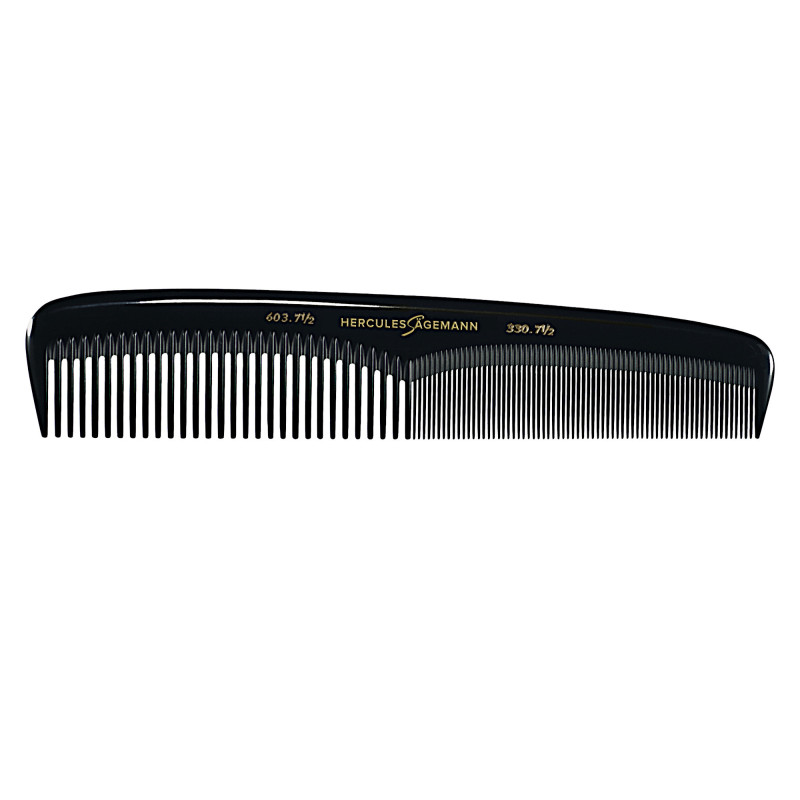 Hřeben na stříhání vlasů Hercules Sägemann 603,7 1/2-330,7 1/2 je vyroben z tepelně odolného materiálu a nereaguje s chemikáliemi, je tedy ideální pro použití v kadeřnickém salonu. Hřeben je kvalitně ručně řezaný, broušený a leštěný. Je vhodný pro všechny typy vlasů a jemný k pokožce. Vzhledem ke své velikosti je ideálním pomocníkem ke stříhání dámských vlasů. Dvě odlišné šířky mezer mezi hroty umožňují snadnější rozčesávání. Zaoblené zuby na hřebenu zabraňují poškození vlasů či pokožky hlavy. Hřeben je vyroben ze 100% přírodního kaučuku, díky čemuž má antistatické vlastnosti.