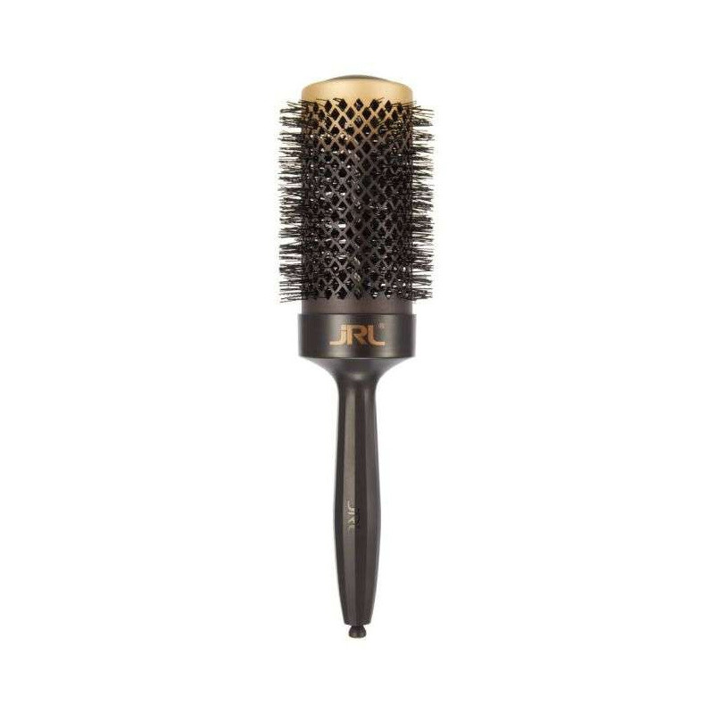 Extra velký iontový foukací kartáč JRL Mixed bristle round brush 53 mm je žáruvzdorný kartáč se smíšenými štětinami ideální pro práci s fénem či jinými tepelnými stylingovými nástroji. Kombinuje rovné iontové štětiny pro zajištění hladkého kartáčování s vlnitými štětinami, které vlasy uchopí a dodávají účesu objem a požadovaný tvar. Při fénování proudí vzduch skrz kartáč mezerou mezi vlnitými štětinami, což zajišťuje rychlé vysoušení i styling vlasů. Válec kartáče je založený na iontové a keramické technologii s grafenem, díky čemuž zajišťuje rovnoměrné rozprostření tepla. Stylovou vychytávkou je, že při kontaktu kartáče s teplým vzduchem, mění válec barvu z černé na zlatou.