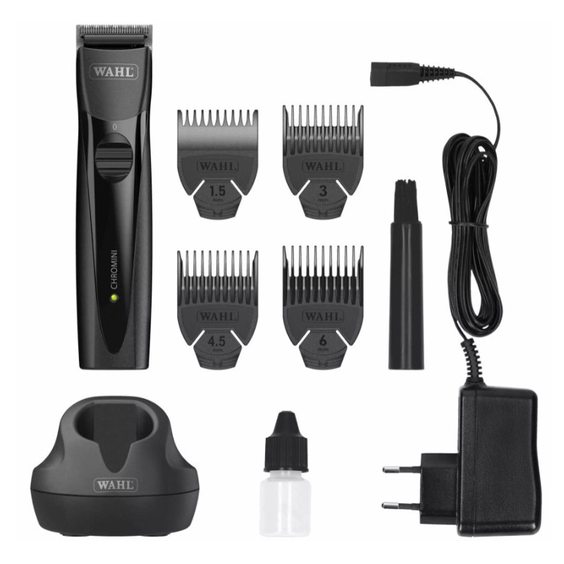 Profesionální konturovací strojek Wahl Chromini 1591-0466 je skvělým pomocníkem pro vytváření kontur, linií a dokončovacích prací. Strojek disponuje motorem o výkonu 7000 otáček za minutu, díky čemuž je vhodný pro úpravu vlasů i vousů. Hlavice U-Blade o šířce 32 mm má velmi nízkou výšku střihu jen 0,3 mm. Hlavici lze ze strojku snadno sejmout a opět nasadit. Součástí balení jsou plastové nástavce o velikosti 1,5 mm, 3 mm, 4,5 mm a 6 mm, díky kterým lze výšku střihu měnit. Ergonomický design, malé rozměry a nízká hmotnost (130 g) umožňují snadnou manipulaci se strojkem pro vytváření nejrůznějších detailů. Doba provozu strojku je až 85 minut, doba nabíjení pak 120 minut. O stavu baterie informuje LED dioda na těle strojku. Balení obsahuje také nabíjecí stojánek a adaptér, čisticí kartáček a olej.