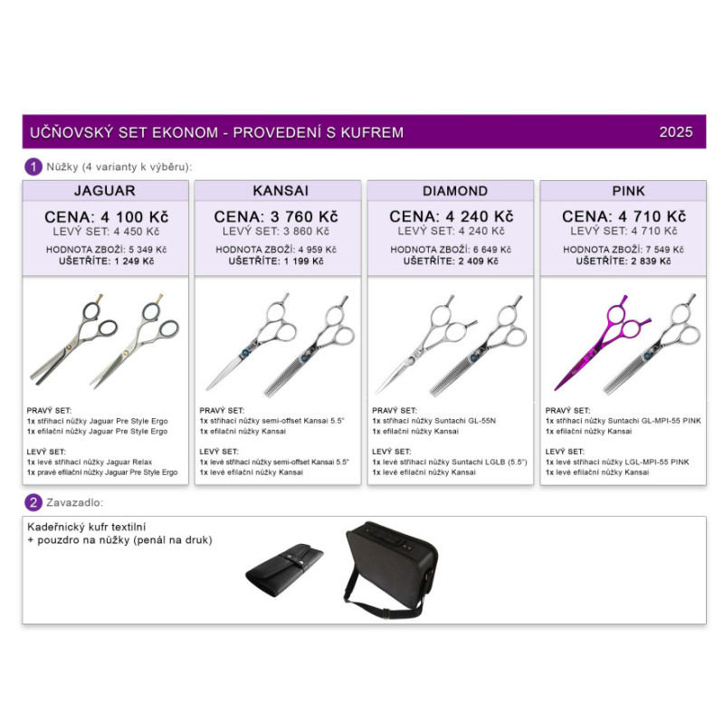 Set je k dispozici ve dvou variantách - textilní kufřík + pouzdro na nůžky nebo taška Matsuzaki s integrovaným pouzdrem na nůžky.