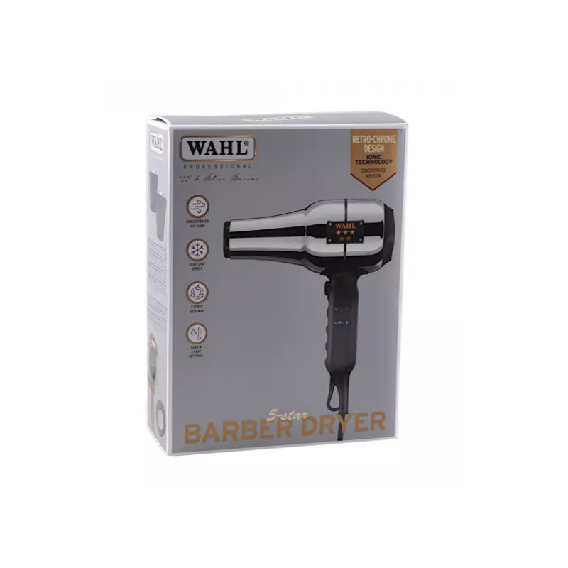 Profesionální fén na vlasy Wahl Barber Dry disponuje AC motorem o výkonu až 2200 W, díky kterému fén umožňuje rychlé a efektivní vysoušení vlasů. Fén je funkcemi a svým retro vzhledem přizpůsobený především do barbershopů. Ionizačně turmalínová technologie zajišťuje šetrné vysoušení vlasů díky generujícím záporným iontů. Během fénování je ve vlasech udržovaná dostatečná hydratace, jsou potlačovány účinky statické elektřiny, krepatění a vlasy jsou ve výsledku hladké a lesklé. Ergonomická rukojeť fénu s tlačítky na vnitřní straně je ideální pro praváky i leváky. Fén má možnost nastavení tří teplot vzduchu a dvou rychlostí profesionálního AC motoru, nechybí ani samostatné tlačítko studeného vzduchu pro zafixování účesu. S fénem se velmi pohodlně manipuluje díky jeho kompaktní velikosti a 2,7 metrů dlouhému kabelu. Součástí balení jsou dvě vzduchové trysky s klik-systémem pro snadné nasazení o rozměrech 65 a 90 mm. Odnímatelný filtr fénu lze snadno vyčistit.