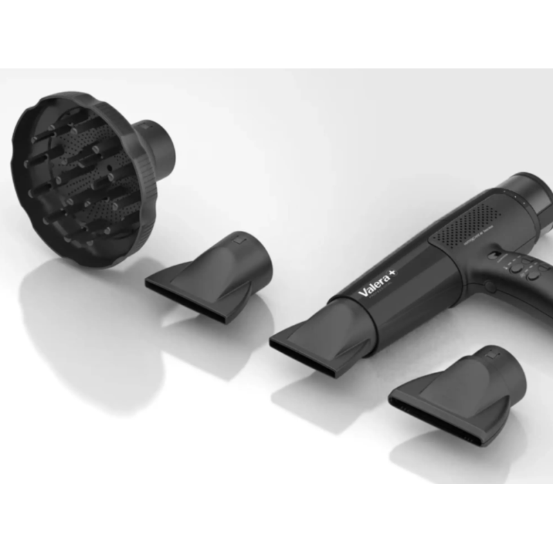 Profesionální vysokorychlostní fén na vlasy Valera Professional MatriXcare AI s výkonem 2000 W byl navržen přesně dle potřeb profesionálních kadeřníků. Superlehký a velmi tichý fén nabízí eleganci a funkční ergonomický design pro precizní výkon, kontrolu a pohodlí. Digitální bezkartáčový motor 100K-Pax s dlouhou životností zajišťuje svými 100 000 otáčkami za minutu velký průtok vzduchu. Ten je ještě zesílen pomocí Air Boost technologie, která znásobí efekt foukaného vzduchu. Fén disponuje ionizační funkcí pro snížení statické elektřiny a pro zachování přirozené vlhkosti ve vlasech, což zabraňuje poletování a vysušování vlasů. Fén nabízí 3 úrovně teploty vzduchu a 3 úrovně rychlosti vzduchu, jejichž aktuální nastavení indikují LED světla. Fén kromě základního nastavení navíc umožňuje vybrat dvě různé konfigurace podle typu vlasů - konfigurace CARE pro jemné a řídké vlasy a konfigurace MAX pro husté a silné vlasy. Duální nastavení teploty a proudění vzduchu tedy poskytuje celkem 18 kombinací, které umožňují zvolit správnou intenzitu foukaného vzduchu pro profesionální péči a kreativní styling podle typu vlasů. Na přední straně rukojeti je umístěno tlačítko studeného vzduchu pro zafixování účesu a zářivý vzhled. Čištění zadního filtru probíhá velmi snadno díky funkci samočistění. LED kontrolka Vás sama upozorní na nutné vyčištění filtru, které probíhá automaticky pomocí obráceného proudu vzduchu. Design výkonných ovládacích spínačů byl navržen speciálně pro intenzivní profesionální používání. Revoluční prvek Rotocord zabudovaný v rukojeti fénu umožňuje otáčení napájecího kabelu o 360 °. Velmi praktickou technologií je chytrá paměťová funkce posledního nastavení hodnot, které zůstávají nastaveny do dalšího použití. Součástí balení je difuzér o průměru 12,7 cm pro perfektní tvarování kudrlin a zvětšení objemu, dvě vzduchové trysky široké 62 a 75 mm a tryska TouchMe široká 82 mm, která Vás ani po delším fénování při kontaktu s kůží nepopálí.