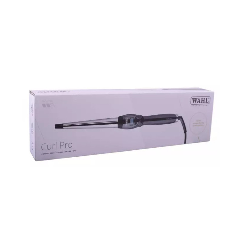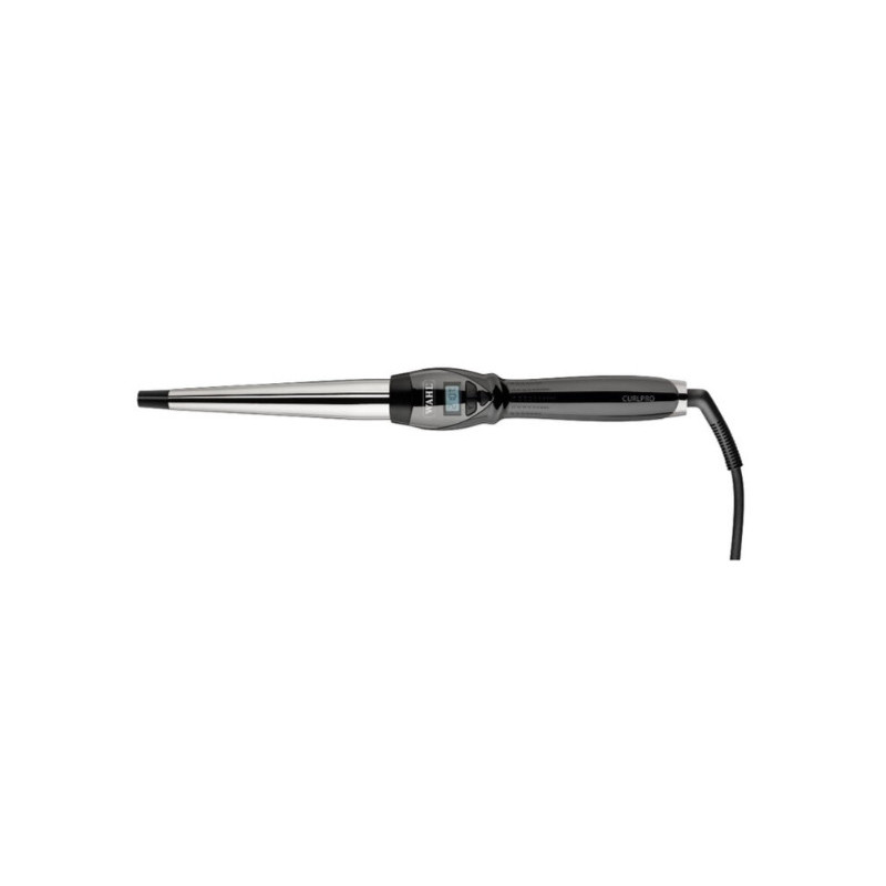 Profesionální kónická kulma na vlasy Wahl CurlPro Conical Curling Iron s titanovým povrchem, který je odolný a pevný, napomáhá redukovat statickou elektřinu a je šetrný k vlasům. Díky jejímu kónickému tvaru kulmy vytvarujete přirozeně vypadající lokny o průměru 13 – 25 mm. Pomocí tlačítek pro snížení / zvýšení teploty lze regulovat teplotu v rozmezí 80 – 210 °C. Kulma se nahřeje za pouhých 30 sekund. LED indikátor informuje o stavu nahřátí kulmy a zobrazuje aktuálně nastavenou teplotu.