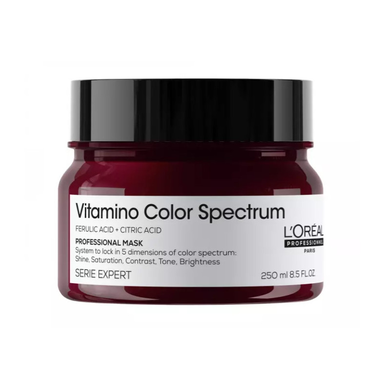 Hydratační maska pro barvené vlasy Loréal Professionnel Serie Expert Vitamino Color Spectrum intenzivně hydratuje a vyživuje vlasová vlákna, zatímco pomáhá uzamknout zářivost barvy až na 100 dní. Její bohatá krémová textura se snadno roztírá do vlasů, okamžitě je vyhlazuje a posiluje, čímž snižuje krepatění a dodává jim hebkost a sílu. Složení masky je obohacené o kyselinu ferulovou, která působí jako silný antioxidant chránící barvu před vyblednutím, a o kyselinu citronovou, jež podporuje dlouhotrvající intenzitu a jas odstínu. Pravidelným používáním poskytuje vlasům až o 62 % více ochrany proti krepatění, zanechává vlasy až o 92 % více hydratované, o 98 % silnější a až o 64 % hebčí po dobu 72 hodin. Maska ve vlasech zanechává příjemnou svěží vůni kombinující tóny rebarbory, citrusů a santalového dřeva.