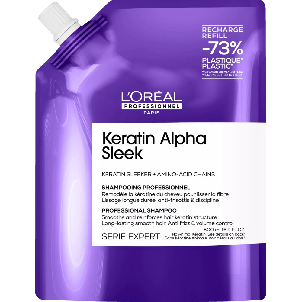 Šampon pro dlouhotrvající uhlazení krepatých vlasů L’Oréal Professionnel Serie Expert Keratin Alpha Sleek přináší jemné a zároveň spolehlivé mytí vlasů, které okamžitě uhladí a posílí vlasový keratin.