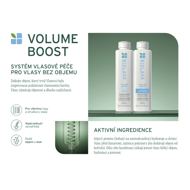 S kondicionérem Biolage Volume Boost Conditioner dodáte jemným vlasům bez objemu přirozenou plnost bez zbytečné zátěže. Nadzvedává vlasy už od kořínků, aniž by je zatěžoval, usnadňuje rozčesávání a poskytuje lehkou hydrataci. Obsahuje mikrodávky mikrofiltrovaného sójového proteinu, který je zdrojem aminokyselin - ty podporují hydrataci, zvyšují hebkost vlasů a pomáhají předcházet lámavosti. Mikrofiltrované polymery posilují vlasovou strukturu, zajišťují přirozené nadzdvižení od kořínků a dodávají dlouhotrvající objem a plnost. Kondicionér tak zachovává vlasům jejich přirozenou hebkost, lesk i pružnost. Je vhodný také pro barvené nebo jemné kudrnaté vlasy, které potřebují jemný objem a lehkou péči. Neobsahuje parabeny, nebyl testován na zvířatech a je balen v obalu s víčkem z recyklovaného plastu.