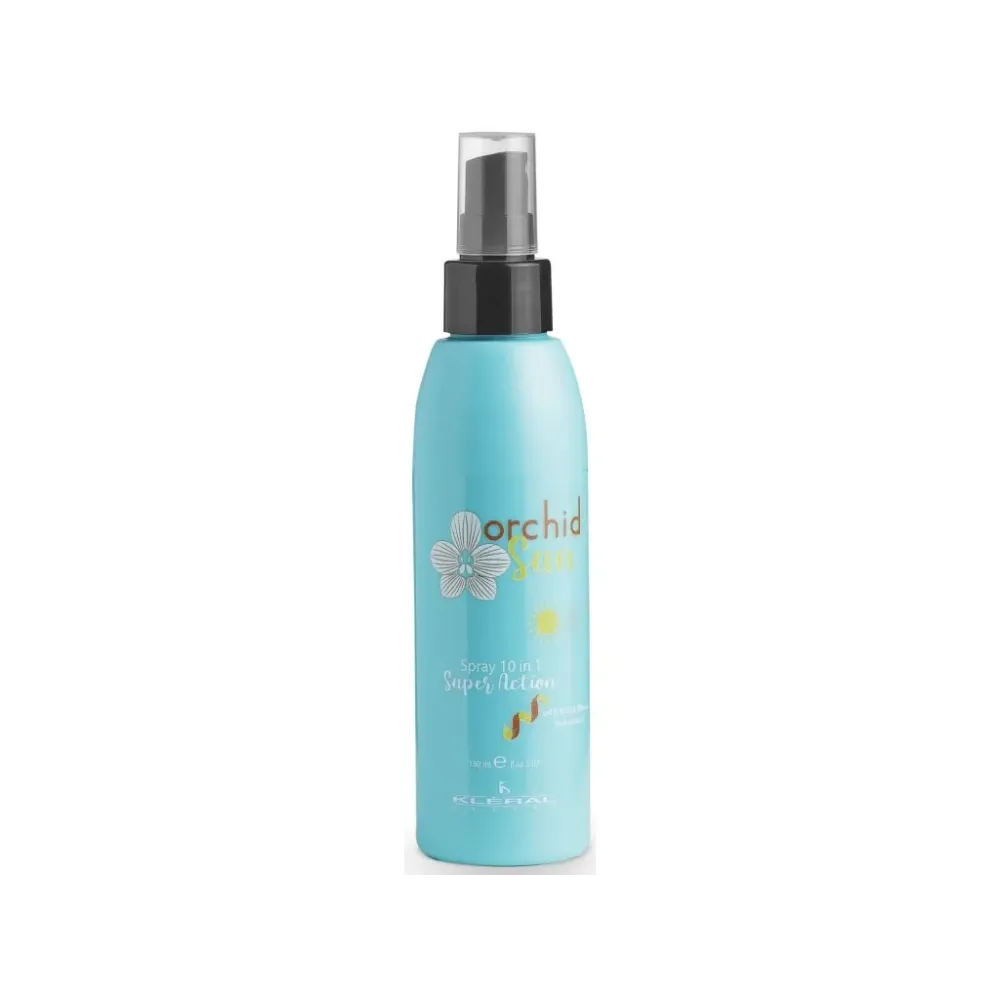 Kléral Orchid Sun 10 in 1 Super Action Spray je hedvábně jemný bezoplachový sprej s rostlinným keratinem, který poskytuje vlasům až 10 účinků v jednom kroku. Okamžitě usnadňuje rozčesávání, zjemňuje a dodává vlasům lesk. Vhodný pro poškozené, suché a sluncem zatížené vlasy – ideální pro použití po umytí nebo přímo na pláži.