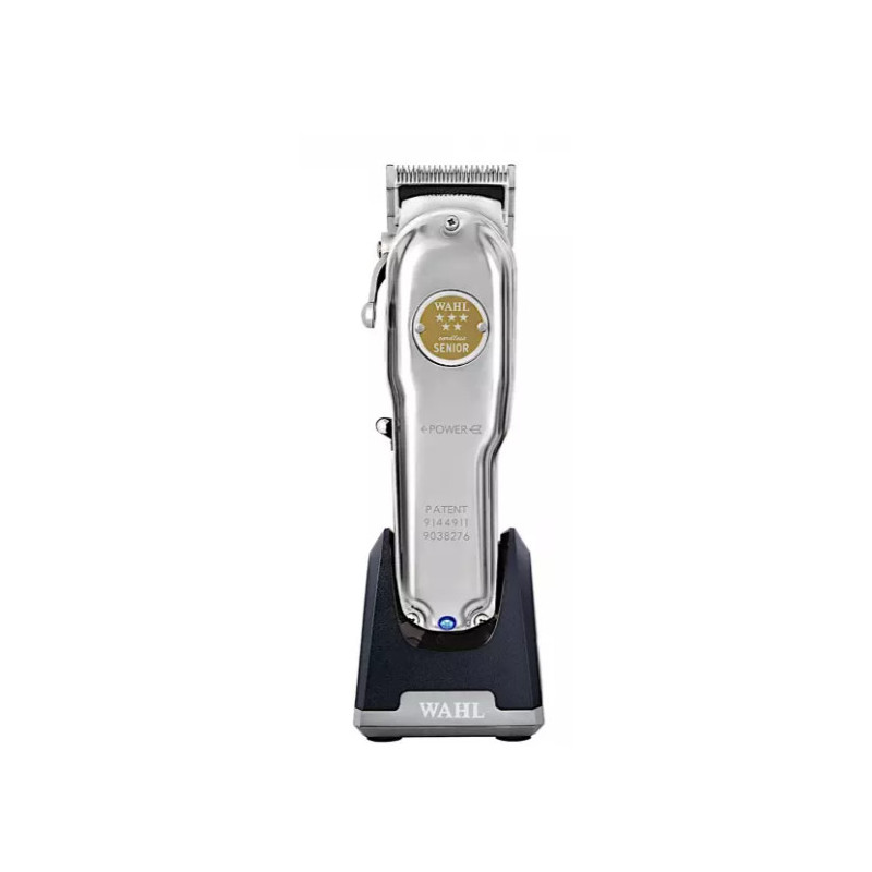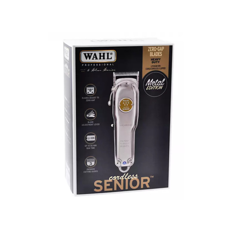 Profesionální strojek Wahl Senior Metal Edition v exkluzivním celokovovém provedení nesmí chybět v žádném barbershopu nebo kadeřnickém saloně. Spolehlivý a silný DC motor s výkonem až 7000 otáček za minutu zajišťuje snadné stříhání vlasů i vousů. Celokovová chromovaná hlavice o šířce 46 mm s nastavitelnou výškou střihu od 0,5 mm do 1,2 mm umožňuje precizní střih. Výšku střihu lze snadno měnit pomocí kovové aretační páčky na boku strojku. Součástí balení jsou také plastové nástavce s kovovou sponou o velikosti 1,5 mm, 3 mm a 4,5 mm. Strojek se svým klasickým tvarem a robustní konstrukcí pohodlně drží v ruce, bezdrátový provoz usnadňuje manipulaci. Lithiová baterie bez paměťového efektu zajišťuje provoz až 80 minut, doba nabíjení je pak 120 minut. O stavu baterie informuje LED dioda na těle strojku. Součástí balení je praktický nabíjecí stojánek s otočnou zásuvkou a také hřeben, čisticí kartáček, olej a krytka hlavice.