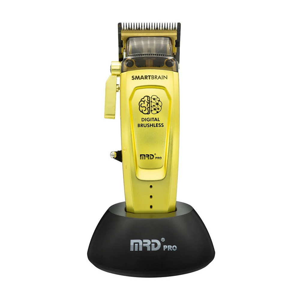 Profesionální střihací strojek na vlasy MRD Pro Smart Brain clipper HC-90-4 Gold s výkonným bezkartáčovým DC motorem s 7200 ot./min., DLC ECHO čepelí a až 2,5 h provozu. Kovové tělo, USB-C nabíjení a magnetické nástavce. Maximální přesnost a top výkon pro barber shop.