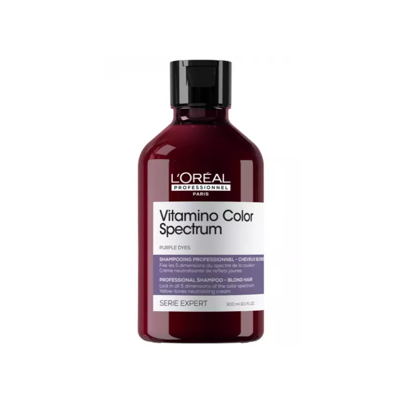 Fialový šampon Loréal Professionnel Serie Expert Vitamino Color Spectrum udržuje blond vlasy stále krásné bez nežádoucích žlutých tónů a pročištěné. Šampon s krémovou texturou obsahuje fialové pigmenty, které okamžitě neutralizují nežádoucí teplé žluté odlesky blond vlasů, a díky pečujícím látkám zanechává vlasy vyživené. Zároveň chrání barvu vlasů a uzamyká její zářivost až po dobu 100 dní. Šampon zachovává tón barvy, zanechává vlasy až o 71 % hebčí, až o 76 % více vyživené a až o 91 % odolnější.