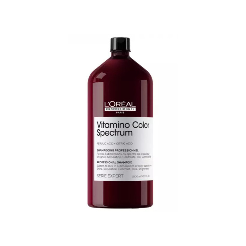 Šampon Loréal Professionnel Serie Expert Vitamino Color Spectrum je ultra pečující šampon pro barvené vlasy, který důkladně pročišťuje vlasová vlákna, a zároveň chrání jejich barvu až po dobu 100 dní. Jeho luxusní krémová textura se při kontaktu s vodou mění v bohatou pěnu, která vlasy důkladně čistí, vyživuje a posiluje. Šampon působí ve všech pěti dimenzích barevného spektra - dodává vlasům ultra vysoký lesk, zvýrazňuje sytost a zářivost barvy, zajišťuje optimální hloubku odstínů, eliminuje nežádoucí mosazné odlesky a udržuje jas světlých i tmavých tónů. Složení šamponu je obohaceno o kyselinu ferulovou, která funguje jako silný antioxidant, chrání barvu před vyblednutím a uzamyká barevné pigmenty uvnitř vlasového vlákna. Kyselina citronová pak pomáhá vyrovnávat pH vlasové pokožky a podporuje vyšší zářivost a sytost barvy. Pravidelným používáním dosáhnete až o 96 % silnějších vlasů, o 68 % větší hebkosti a až o 62 % více vyživených vlasů po dobu až 72 hodin. Šampon ve vlasech zanechává příjemnou svěží vůni kombinující tóny rebarbory, citrusů a santalového dřeva.