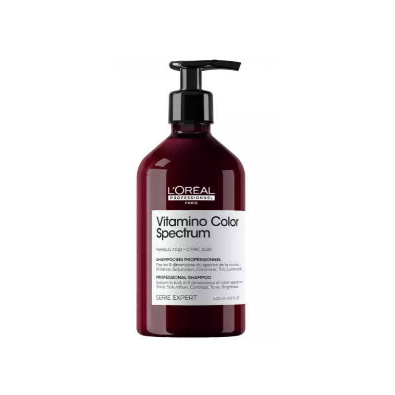 Šampon Loréal Professionnel Serie Expert Vitamino Color Spectrum je ultra pečující šampon pro barvené vlasy, který důkladně pročišťuje vlasová vlákna, a zároveň chrání jejich barvu až po dobu 100 dní. Jeho luxusní krémová textura se při kontaktu s vodou mění v bohatou pěnu, která vlasy důkladně čistí, vyživuje a posiluje. Šampon působí ve všech pěti dimenzích barevného spektra - dodává vlasům ultra vysoký lesk, zvýrazňuje sytost a zářivost barvy, zajišťuje optimální hloubku odstínů, eliminuje nežádoucí mosazné odlesky a udržuje jas světlých i tmavých tónů. Složení šamponu je obohaceno o kyselinu ferulovou, která funguje jako silný antioxidant, chrání barvu před vyblednutím a uzamyká barevné pigmenty uvnitř vlasového vlákna. Kyselina citronová pak pomáhá vyrovnávat pH vlasové pokožky a podporuje vyšší zářivost a sytost barvy. Pravidelným používáním dosáhnete až o 96 % silnějších vlasů, o 68 % větší hebkosti a až o 62 % více vyživených vlasů po dobu až 72 hodin. Šampon ve vlasech zanechává příjemnou svěží vůni kombinující tóny rebarbory, citrusů a santalového dřeva.