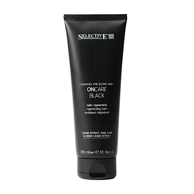 Regenerační balzám pro poškozené vlasy Selective Professional OnCare Black Regenerating Balm je speciálně vyvinutý pro obnovu a posílení velmi namáhaných a poškozených blond i tmavých vlasů. Jeho vysoce účinné složení s výživnými a regeneračními složkami hloubkově hydratuje a posiluje vlasová vlákna. Prášek z dřevěného uhlí s detoxikačními účinky účinně udržuje vlasy lehké, lesklé a čisté. Extrakt z černého kaviáru, známý jako "černé zlato", hloubkově vyživuje vlasy, posiluje jejich strukturu a díky antioxidantům je chrání před poškozením i předčasným stárnutím. Šnečí sliz, obsahující kolagen a kyselinu glykolovou, hydratuje, zpevňuje a obnovuje vlasy, čímž zvyšuje jejich pružnost a hebkost. Extrakt ze zeleného kaviáru vyživuje, hydratuje a chrání vlasy, dodává jim sílu, vitalitu a dlouhotrvající zdravý vzhled. Balzám se sladkou květinovou a pižmovou vůní intenzivně regeneruje vlasy, obnovuje jejich vitalitu, lesk a hebkost, aniž by zanechával černý pigment.