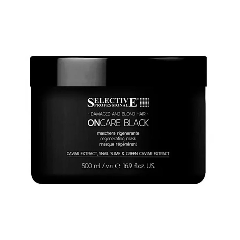 Selective Professional OnCare Black Regenerating Mask je vysoce účinná regenerační maska, která intenzivně obnovuje strukturu vlasů. Je vhodná pro zvláště poškozené blond i tmavé vlasy. Prášek z dřevěného uhlí s detoxikačními účinky udržuje vlasy lehké, lesklé a čisté. Extrakt z černého kaviáru, známý jako "černé zlato", hloubkově vyživuje vlasy, posiluje jejich strukturu a díky antioxidantům chrání vlasy před poškozením a předčasným stárnutím. Šnečí sliz obsahuje kolagen a kyselinu glykolovou, které vlasy hydratují, zpevňují a obnovují, čímž zvyšují jejich pružnost a hebkost. Extrakt ze zeleného kaviáru hydratuje, vyživuje a chrání vlasy, čímž jim dodává sílu, vitalitu a dlouhotrvající zdravý vzhled. Díky kokosovému oleji jsou vlasy lesklejší a poddajnější již po prvním použití, dodává jim mimořádnou hebkost, pomáhá zacelovat konečky a bojuje proti krepatění. Maska nezanechává černý pigment a doprovází ji sladká květinová a pižmová vůně.