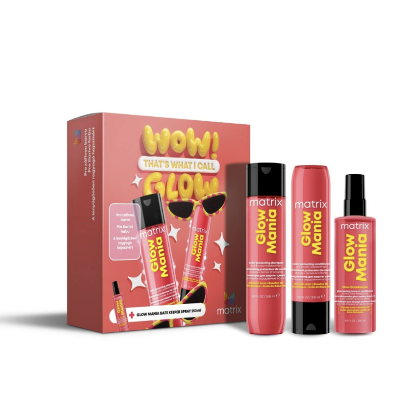 Zachovejte sytost a lesk barvených vlasů déle díky sadě Matrix Glow Mania. Tři produkty obohacené o šípkový olej a kyselinu glykolovou pomáhají chránit barvu, vyhlazují povrch vlasu a dodávají mu viditelný lesk. Jemné textury nezatěžují vlasy a usnadňují každodenní péči.