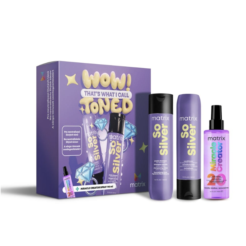 Udržujte blond a šedé vlasy zářivé, lesklé a hebké s profesionální sadou Matrix So Silver. Tři produkty společně neutralizují nežádoucí žluté tóny, hydratují a dodávají vlasům hladkost i ochranu při každodenním stylingu.