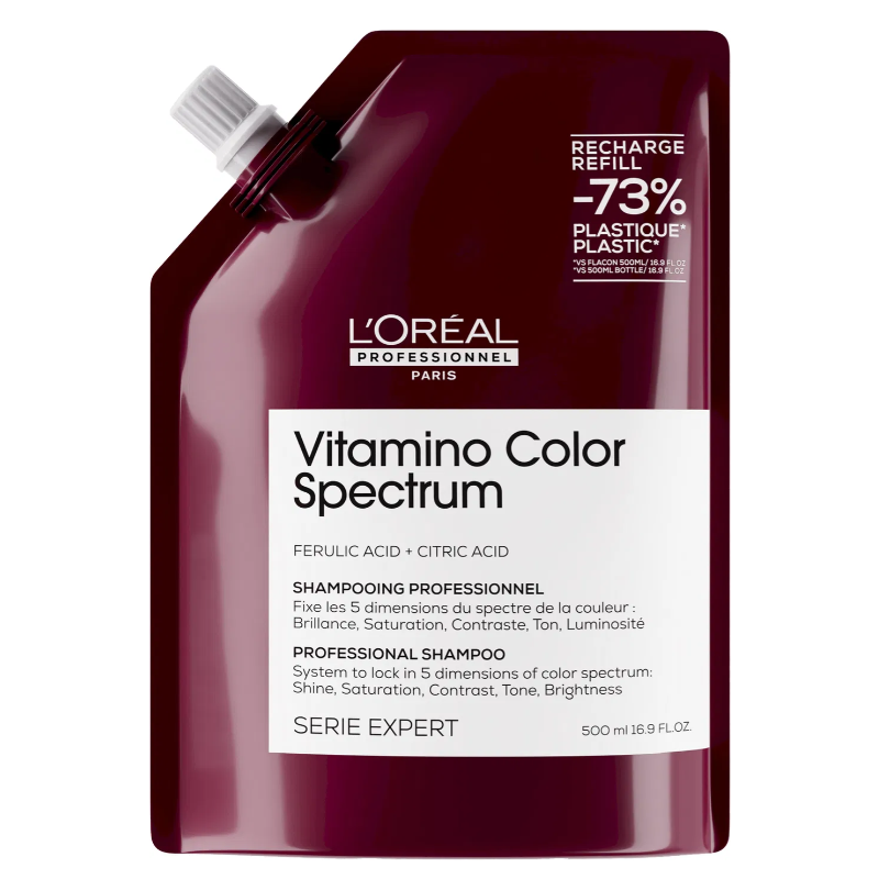 Šampon Loréal Professionnel Serie Expert Vitamino Color Spectrum je ultra pečující šampon pro barvené vlasy, který důkladně pročišťuje vlasová vlákna, a zároveň chrání jejich barvu až po dobu 100 dní. Jeho luxusní krémová textura se při kontaktu s vodou mění v bohatou pěnu, která vlasy důkladně čistí, vyživuje a posiluje. Šampon působí ve všech pěti dimenzích barevného spektra - dodává vlasům ultra vysoký lesk, zvýrazňuje sytost a zářivost barvy, zajišťuje optimální hloubku odstínů, eliminuje nežádoucí mosazné odlesky a udržuje jas světlých i tmavých tónů. Složení šamponu je obohaceno o kyselinu ferulovou, která funguje jako silný antioxidant, chrání barvu před vyblednutím a uzamyká barevné pigmenty uvnitř vlasového vlákna. Kyselina citronová pak pomáhá vyrovnávat pH vlasové pokožky a podporuje vyšší zářivost a sytost barvy. Pravidelným používáním dosáhnete až o 96 % silnějších vlasů, o 68 % větší hebkosti a až o 62 % více vyživených vlasů po dobu až 72 hodin. Šampon ve vlasech zanechává příjemnou svěží vůni kombinující tóny rebarbory, citrusů a santalového dřeva.