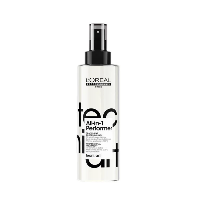 L'Oréal Professionnel Tecni Art All-In-1 Performer představuje jednoduché řešení pro každodenní péči o vlasy – jeden produkt, mnoho účinků. Jeho pečující komplex pomáhá uhladit povrch vlasů a uzavírat vlasové vlákno, což podporuje celkovou ochranu při úpravě i běžném nošení. Kúra zároveň výrazně redukuje krepatění až na 24 hodin a dodává vlasům viditelný lesk.