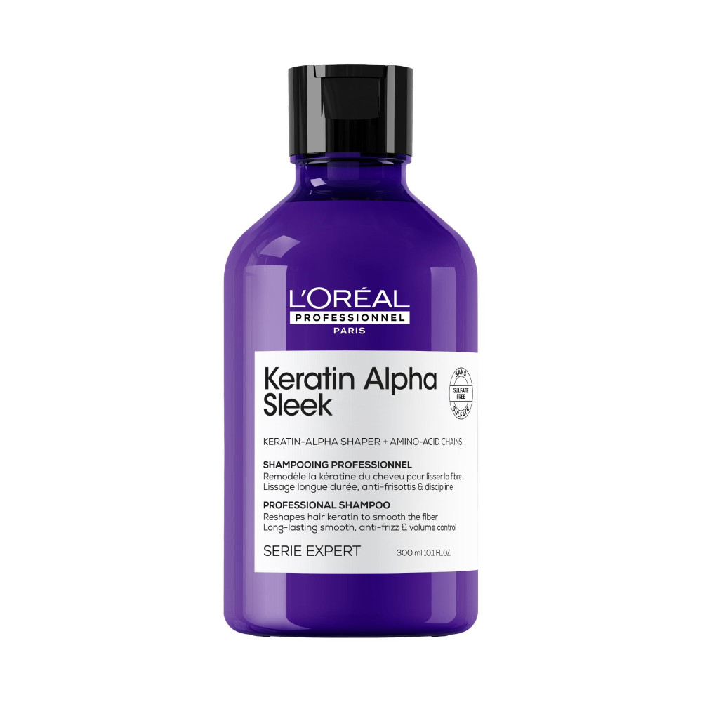 Šampon pro dlouhotrvající uhlazení krepatých vlasů L’Oréal Professionnel Serie Expert Keratin Alpha Sleek přináší jemné a zároveň spolehlivé mytí vlasů, které okamžitě uhladí a posílí vlasový keratin.