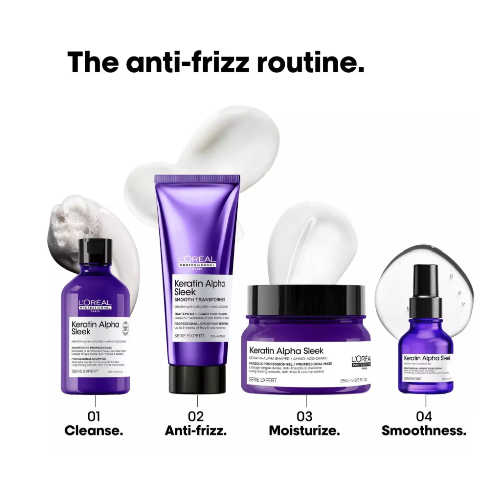 Tip: Pro optimální výsledky zakončete styling žehličkou na vlasy nastavenou na 210 °C. Na jemné až střední vlasy použijte 2-4 střiky séra, pro pevnější vlasy aplikujte 6-8 střiku. Pro dlouhotrvající uhlazení krepatých vlasů používejte celou řadu L’Oréal Professionnel Serie Expert Keratin Alpha Sleek.