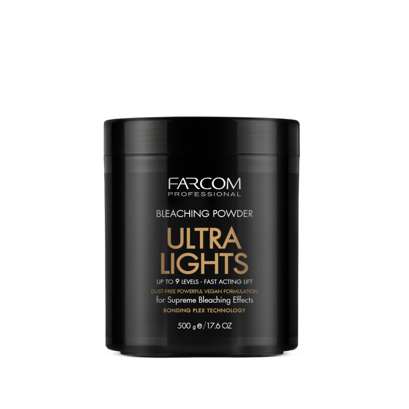 V nekovové misce smíchejte 1 díl odbarvovacího prášku FARCOM PROFESSIONAL ULTRA LIGHTS se 2 díly CREAM DEVELOPER a naneste na suché neumyté vlasy.